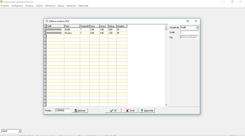 - definice vlastností jednotlivých souborů (např. počet cen PLU, počet period uzávěrek PLU...)
